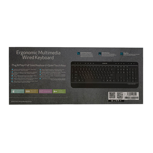 کیبورد کینگ استار مدل kb97 از نوع سیم دار میباشد و از طریق درگاه USB به کامپیوتر متصل میشود. این کیبورد دارای 104 کلید برای انجام فعالیتهای کامپیوتری است. همچنین کیبورد kb97 دارای 18 کلید میانبر به منظور انجام سریعتر کارهاست که عبارتند از Prev. Page, Next Page, Web Home, email, Search, Refresh, Setting, Play/Pause, Prev. Track, Next Track, Stop, Volume, Mute, Music, Sleep, Awake, Power. کیبورد کینگ استار مدل kb97 برای استفادههای روزمره مناسب میباشد. از دیگر ویژگیهای این کیبورد محصول کمپانی کینگ استار، طراحی کلیدها به گونهای که امکان تایپ کردن در مدت زمانی طولانی را فراهم می کند، دسترسی راحت به تمامی کلید های کاربردی، طراحی نرم و سایلنت کلید ها، با دوام و دارای کلید های مات میباشد.