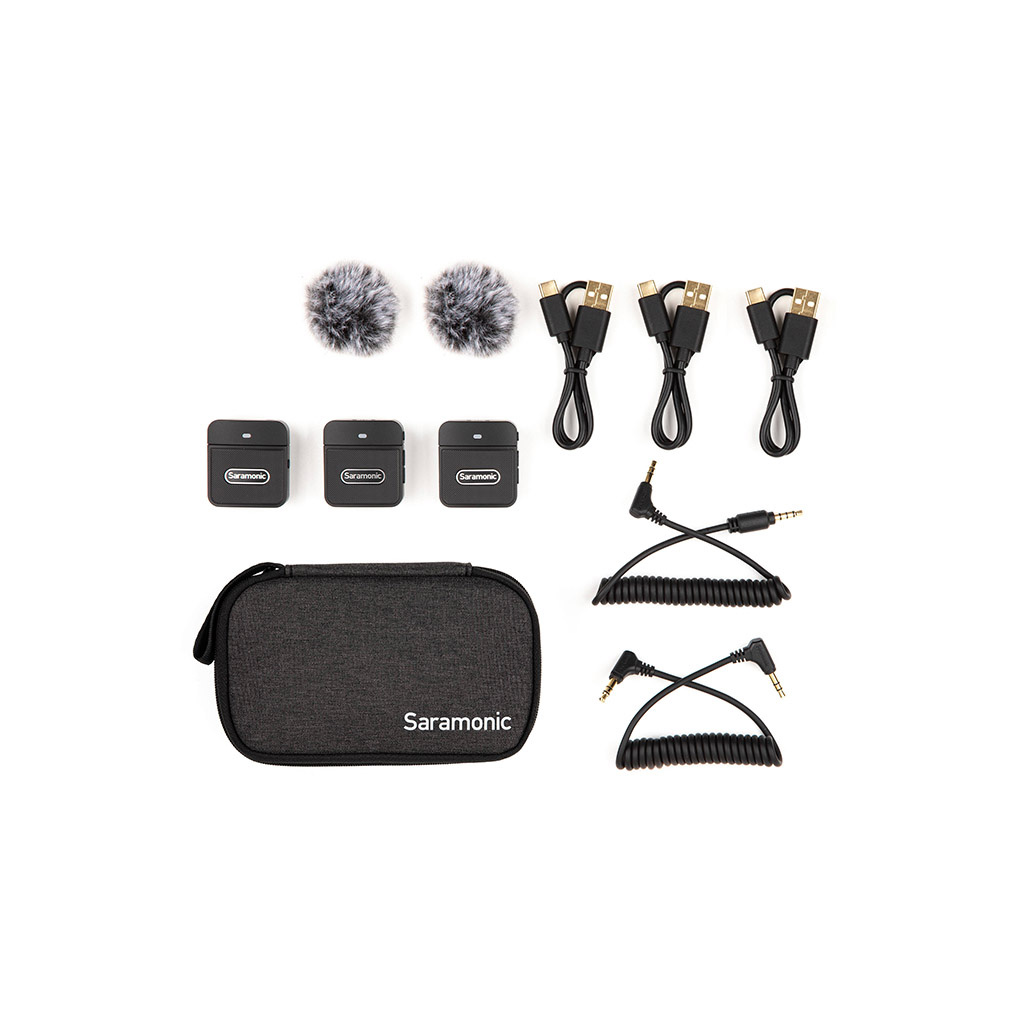 کیف حمل، گیرنده Blink100 RX، دو عدد فرستنده Blink100 TX، کابل 3.5mm TRS به 3.5mm TRS، کابل 3.5mm TRSبه 3.5mm TRRS، سه عدد کابل شارز USB-C، دو عدد خز بادگیر